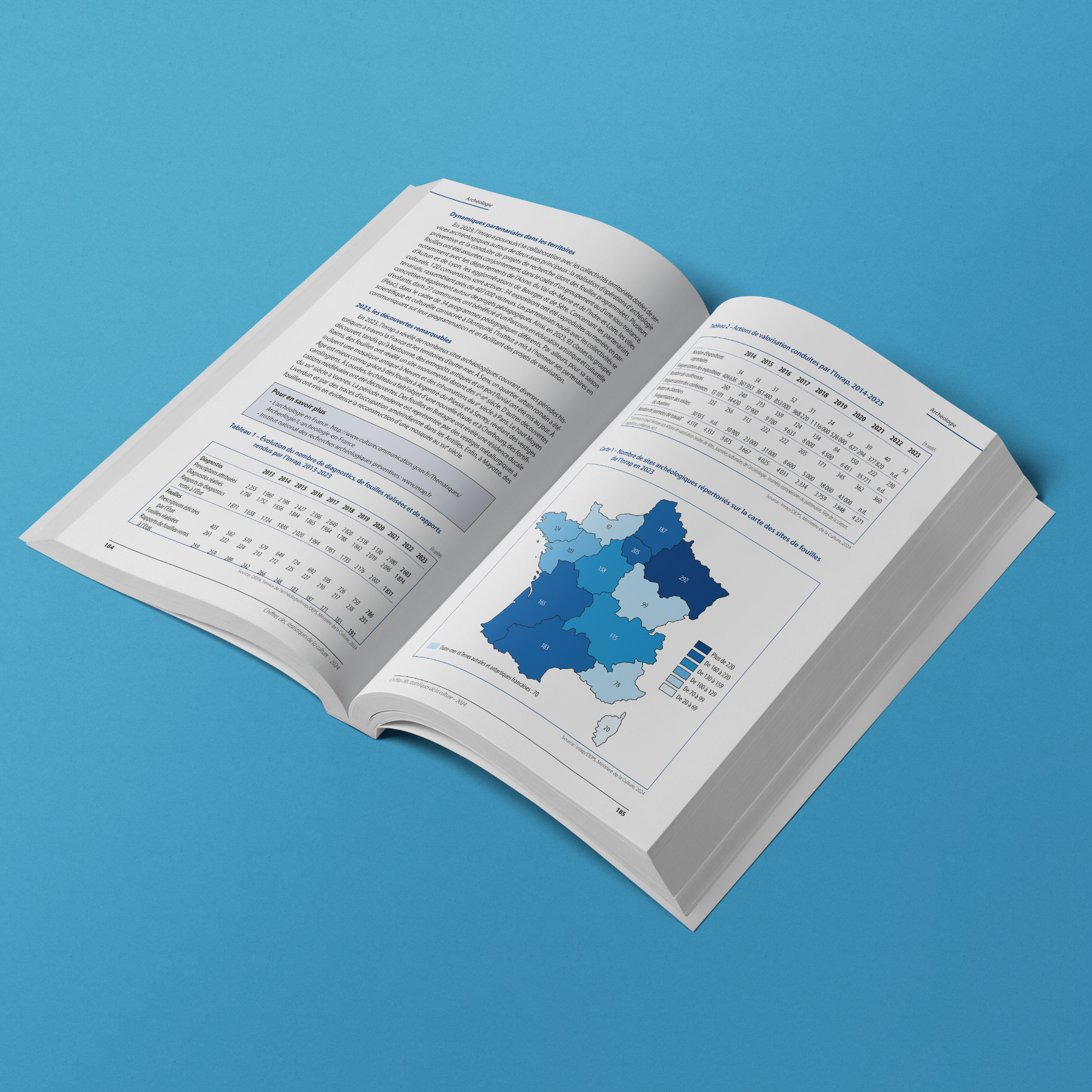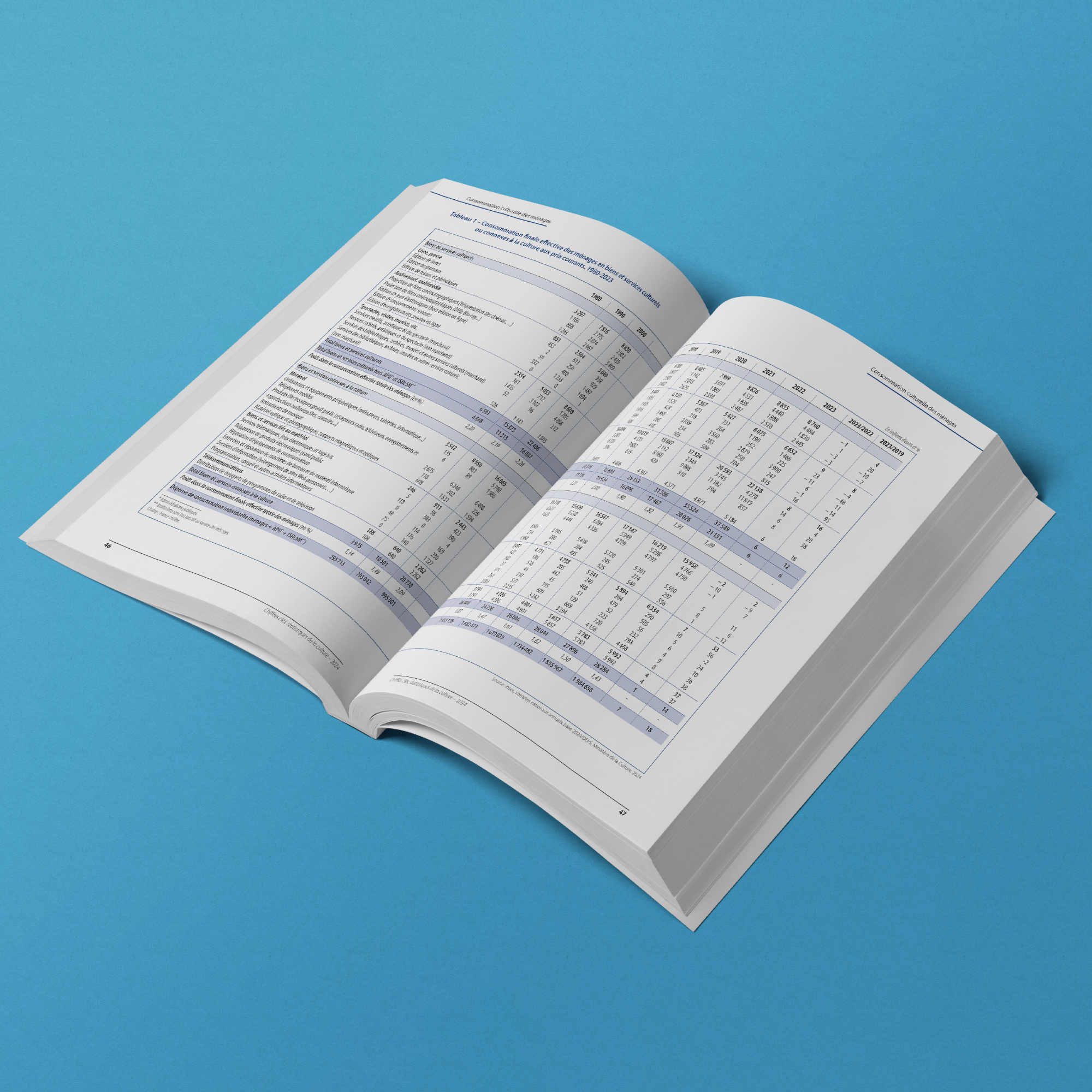 Notre intervention commence par un accompagnement éditorial attentif : nous travaillons sur la structuration d’ensemble de l’ouvrage (parties, chapitres, entrées thématiques), la hiérarchisation des informations et la rédaction ou l’ajustement des titres, intertitres, légendes et encadrés, afin de rendre accessibles et comparables des séries statistiques riches et complexes. Nous assurons la conception graphique et la mise en page, en intégrant un volume important de tableaux, séries chronologiques, notes méthodologiques et annexes, tout en préservant lisibilité, cohérence et confort de lecture, dans le respect de la charte du ministère.