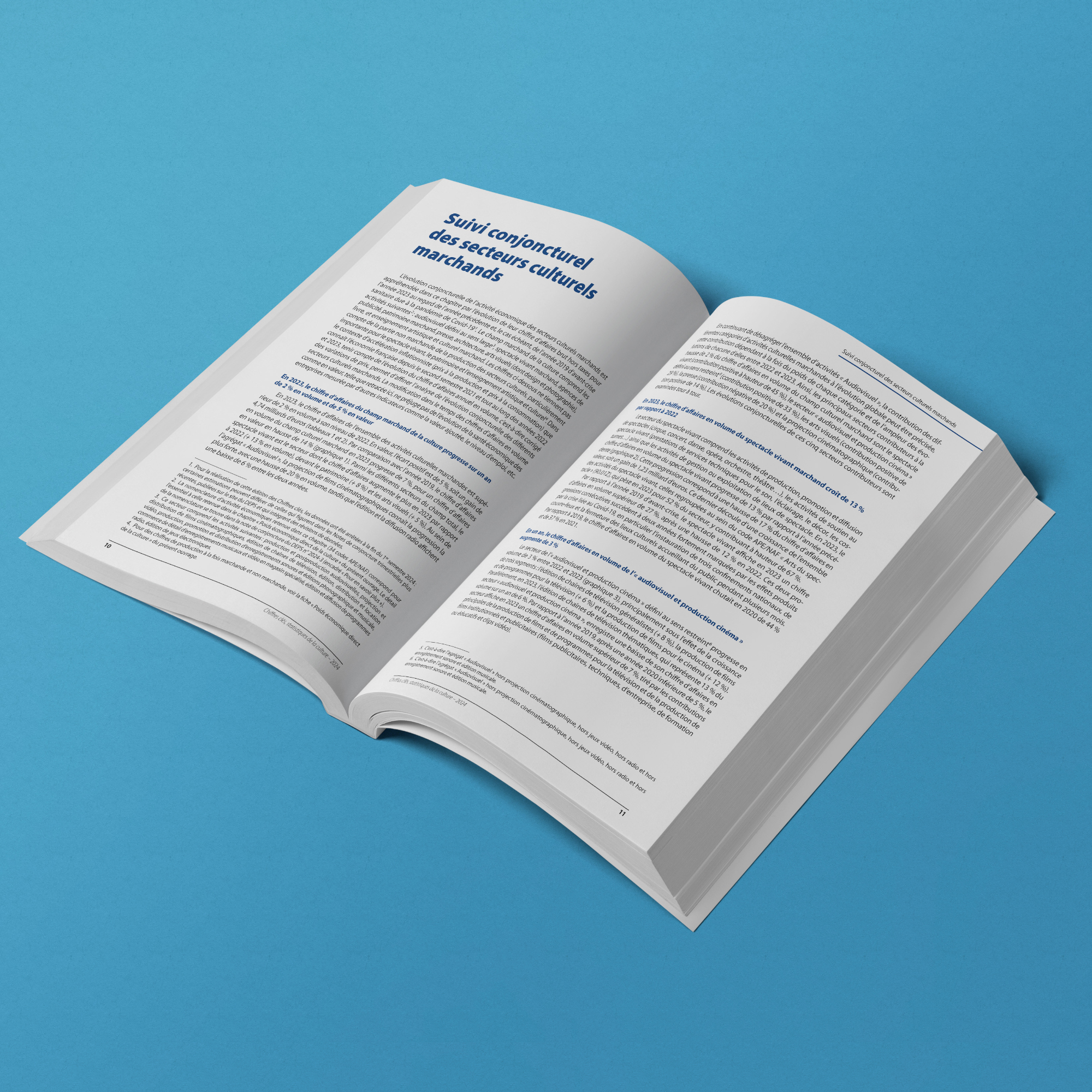 Nous créons également les infographies et l’ensemble des éléments visuels : tableaux, graphiques, cartographies et autres illustrations sont recherchés, conçus et traités avec soin pour transformer les données en repères visuels clairs, pédagogiques et harmonisés sur l’ensemble de l’ouvrage. Nous prenons en charge le traitement d’articles ou de sections en langue anglaise et assurons la relecture et la correction de tous les contenus (textes, légendes, notes, bibliographies). À chaque édition, nous veillons à la précision des chiffres, aux détails typographiques et à l’homogénéité formelle, pour livrer au DEPS un ouvrage structuré, fiable et parfaitement adapté à la diffusion des statistiques de la culture et de la communication.