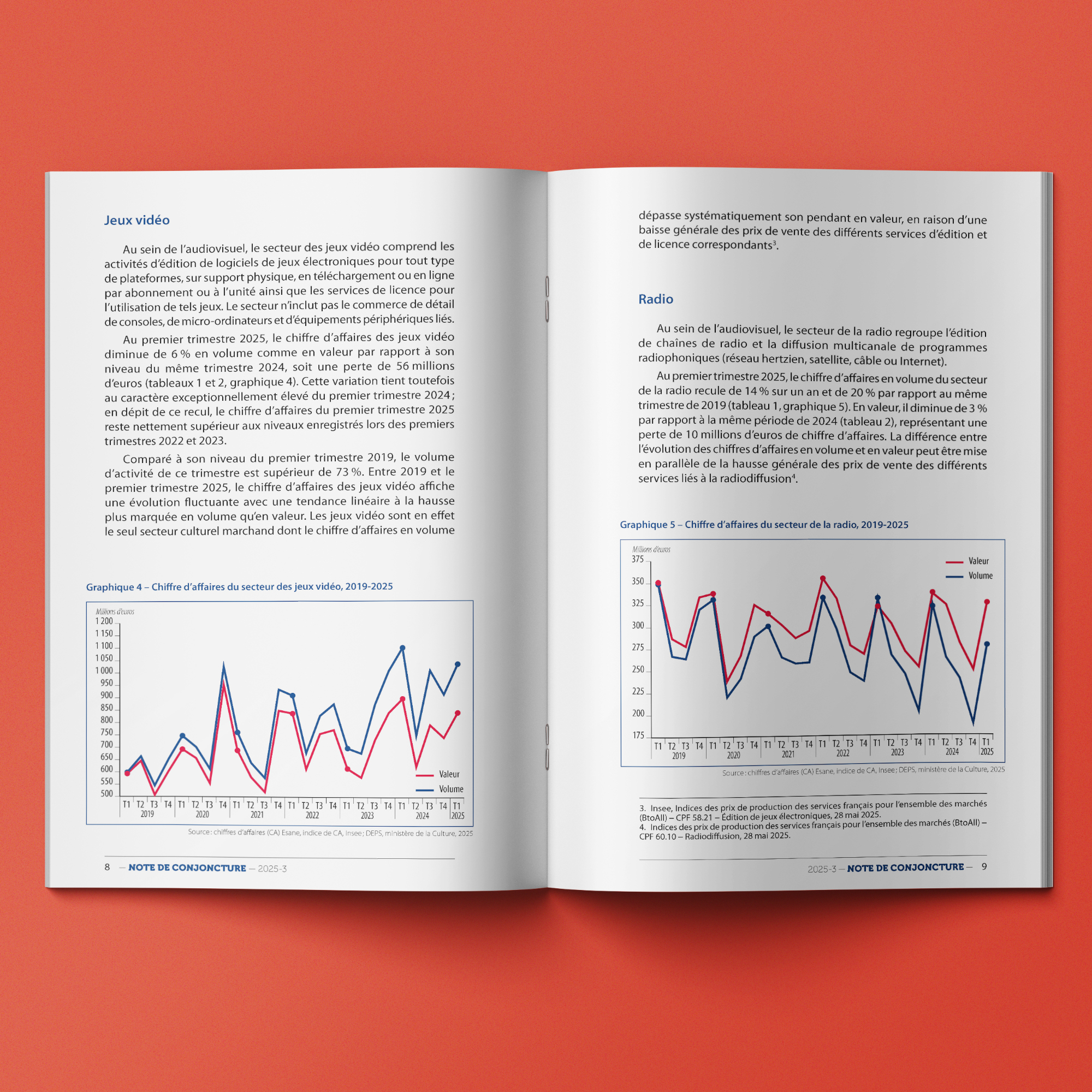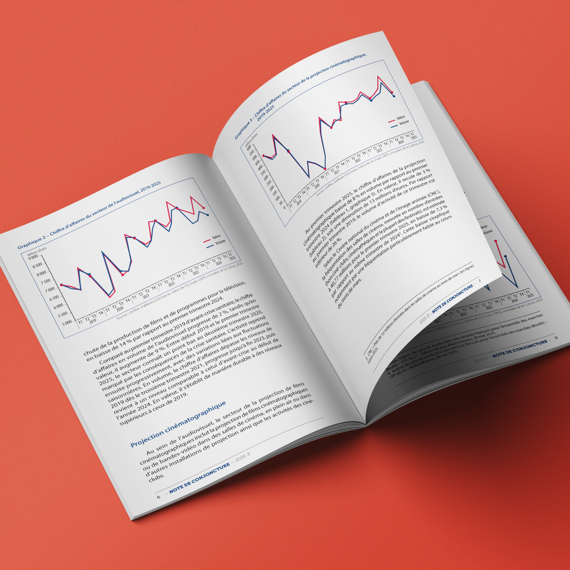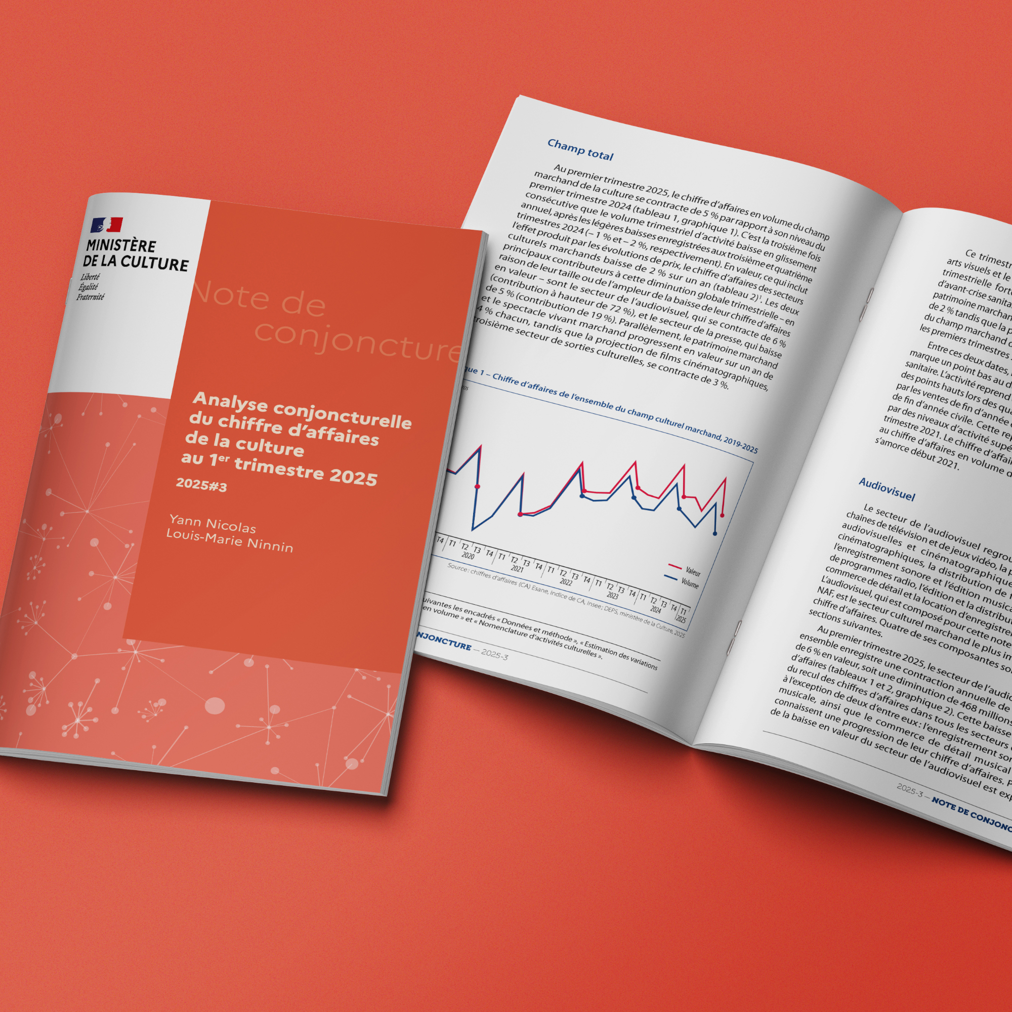 Nous accompagnons le DEPS du ministère de la Culture dans la conception et la production des Notes de conjoncture trimestrielles, qui suivent l’évolution de l’activité économique du champ marchand de la culture à partir des indices de chiffre d’affaires en volume et en valeur déclarés à la direction générale des Finances publiques. À chaque nouvelle note, nous veillons à conjuguer exigence statistique, clarté éditoriale et cohérence graphique de la collection.