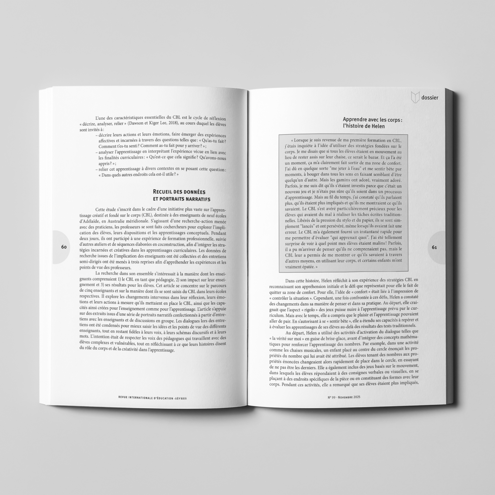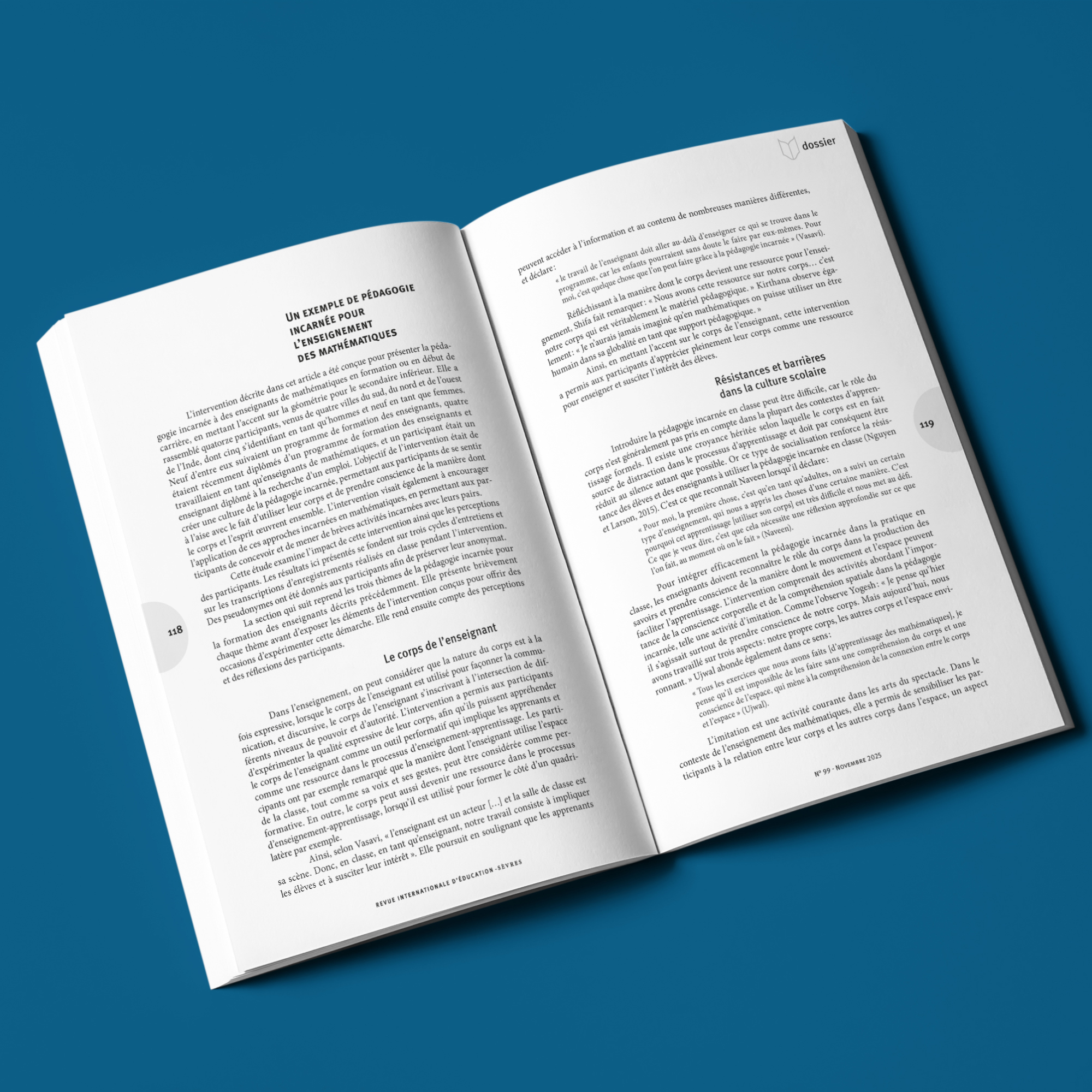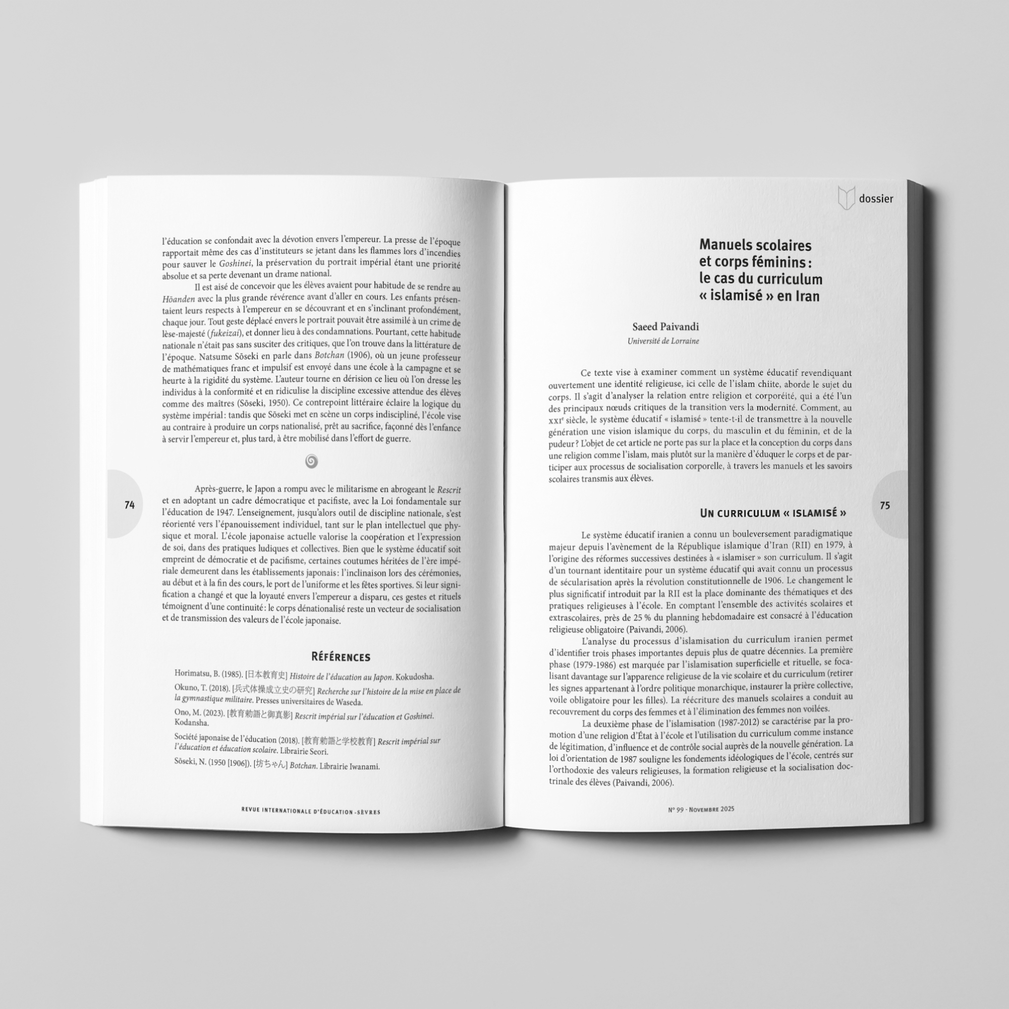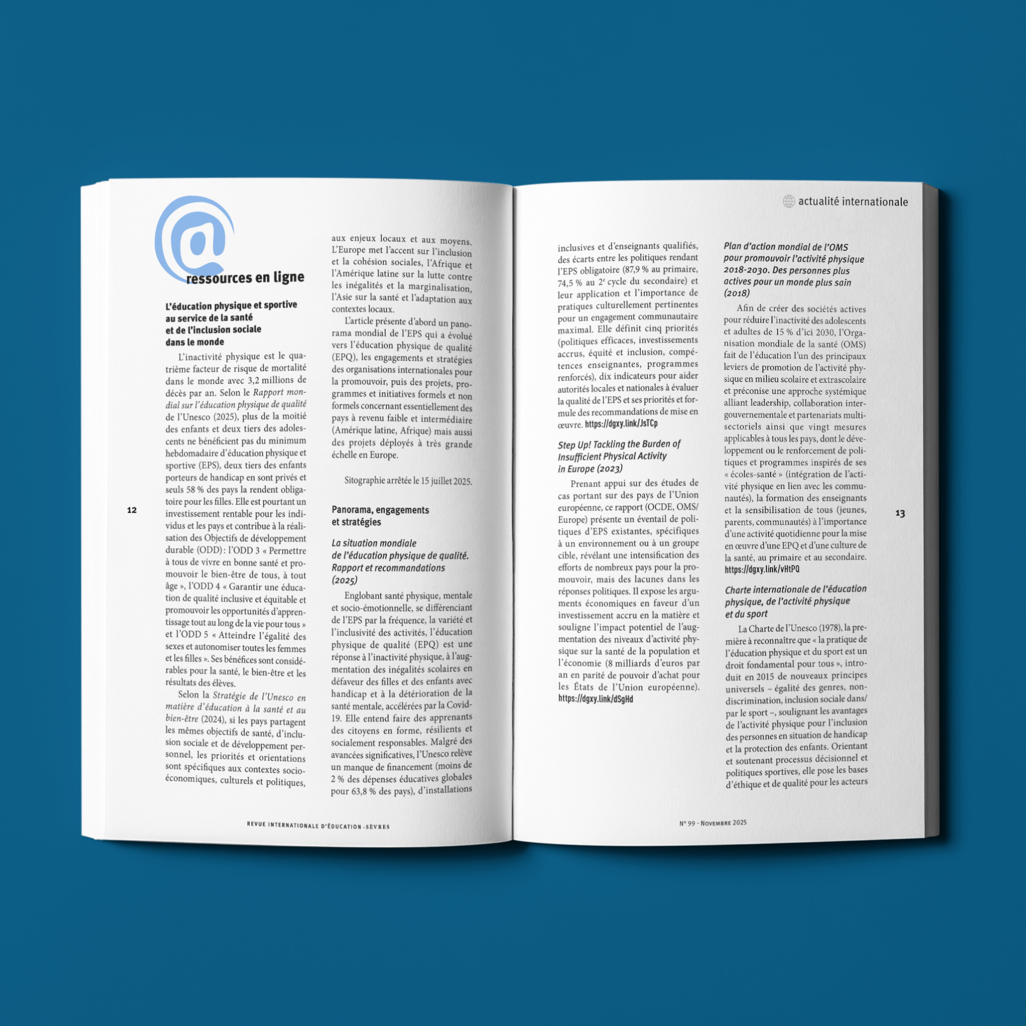 Nous accompagnons la Revue internationale d’éducation de Sèvres, éditée par France Éducation international, depuis 2020, de la préparation des numéros à leur mise en ligne. Chaque année, nous assurons la mise en page d’environ trois numéros de 170 pages, en respectant la maquette de la revue et en veillant à la hiérarchisation des contenus, à la lisibilité et à l’équilibre graphique entre articles, encadrés, tableaux et illustrations.